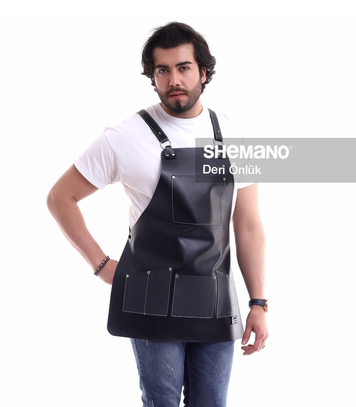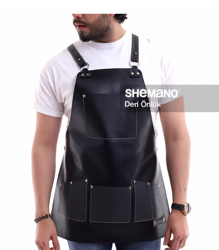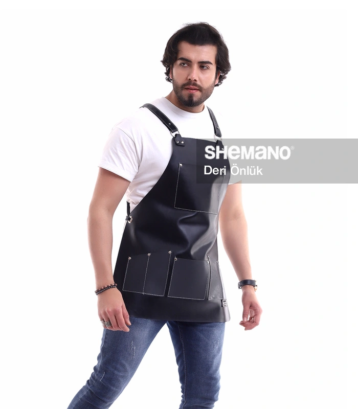 Siyah deri önlük modelimiz, doğal ve gerçekçi görünüme sahip kaliteli suni deriden üretilmiştir.